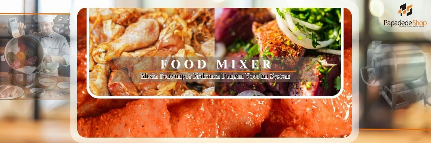 Mesin pencampur makanan (vacuum tumbler) ini dirancang dengan sistem vakum dimana pencampuran bumbu dan makanan dalam keadaan kedap. Proses pencampuran ini membuat pori-pori daging atau sayur menjadi melebar dan membuat bumbu mudah masuk ke inti makanan tersebut. Proses pengadukan makanan yang rata dan merasuk. Sistem vakum ini juga membuat daging menjadi lebih lembut, lebih empuk, lebih kenyal dan lezat. Proses yang dibutuhkan dalam menggunakan mesin ini adalah berkisar 15-20 menit. Kondisi mesin dengan sistem rotary, posisi mesin dibalik membuat produk keluar dan memudahkan untuk dicuci.
